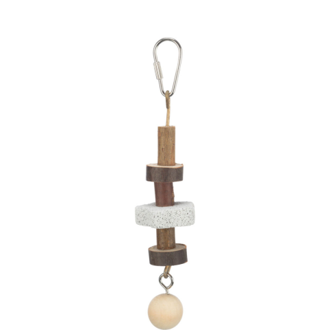 Madárcsőr-kopogtató játék, mely fából és lávakőből áll, ideális méretével serkenti a madarak szellemi és fizikai aktivitását. Kiváló minőségű anyagokból készült, amely garantálja a tartósságot és madarad egészségét támogatja. Ez a kivételes csőrkoptat