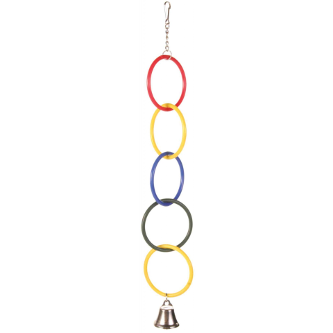 Ez a színes Trixie madárjáték igazán kellemes elfoglaltságot jelenthet kedvencének. Az összefűzött színes karikák végén kis csengő található. A játék tetejére rögízett kapoccsal könyedén felakaszthatja bárhová a kalitkában. Mérete: 25cm