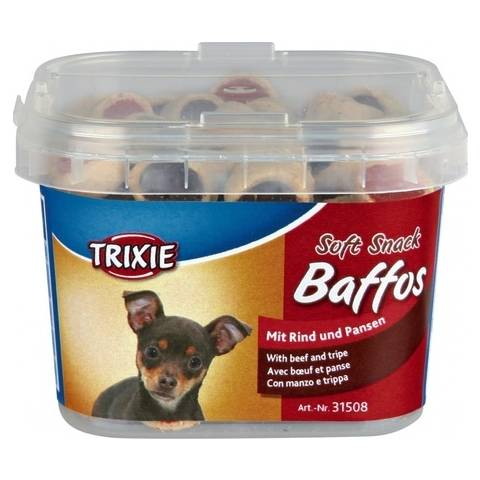 Baffos (140g) Trixie Baffos Snack ínycsiklandó jutalomfalat marha és pacal ízesítésben, különösen a kis termetű és kölyökkutyák számára. Vödrös kiszerelésben. különösen kis kutyák és kölyökkutyák esetén marhahússal és csonttal visszazárható csomagolásban Adagolás: naponta jutalomként adható a normál étkezések között. Az állat előtt mindig legyen friss, tiszta ivóvíz. Kedvtelésből tartott állatok etetésére szolgáló termék! Tartalom / S