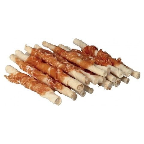 Chicken Chewing Rolls (240g) Trixie Denta Fun Chicken Chewing Rolls rágórúd szárított csirke hússal betekerve kutyák számára. nyers csirkehús bevonattal különösen vastag bőr a hosszabb rágáshoz Adagolás: jutalomként naponta adható. Az állat előtt mindig legyen friss, tiszta ivóvíz. Csak takarmányozási célra! Méretek: 12 cmTartalom / Súly: 30 db / 240 g