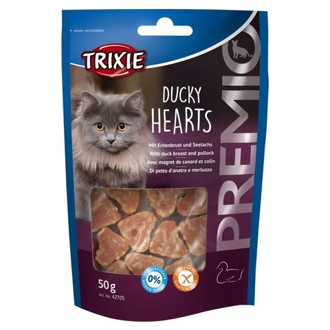 PREMIO Ducky Hearts Kacsamellből és sárga tőkehalból készült jutalomfalat macskáknak. Ízfokozók, aromák, színezékek, tartósítószer nélkül! kacsamell és sárga tőkehal hústartalom 65%, haltartalom 18% visszazárható tasakban Tartalom / Súly: 50 g