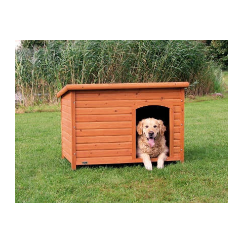 Kutyaház L (116x82x79cm) Trixie Natura prémium minőségű fa kutyaház. Kiváló minőségű fenyőből készült lakkozott ház kutyák számára, melynek teteje nyitható ezáltal a belseje könnyedén tisztítható. 4 lábon áll, amiken műanyag védőburok található, így a nedvesség nem károsítja ezeket. A ház tetejét bitumenes zsindely borítja, ami 100%-os vízhatlanságot biztosít. Lapraszerelve szállítjuk. Hőfüggöny külön rendelhető hozzá. Méretei: külső: 1