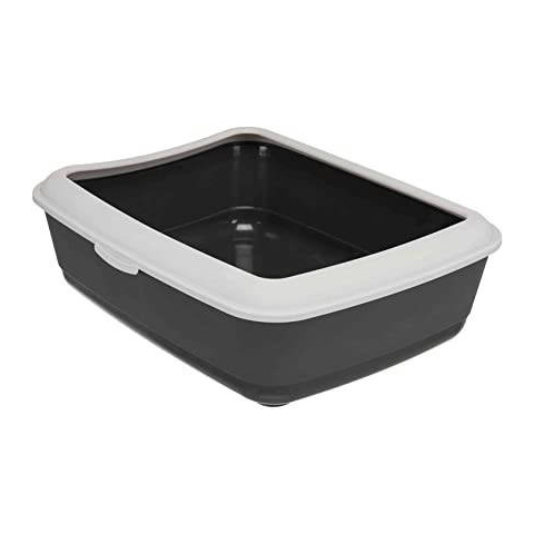 Tágas, peremes macska alom tálca. Könnyen tisztítható. Anyaga: Műanyag. Méretei: 37x15x47cm Színe: sötétszürke/fehér