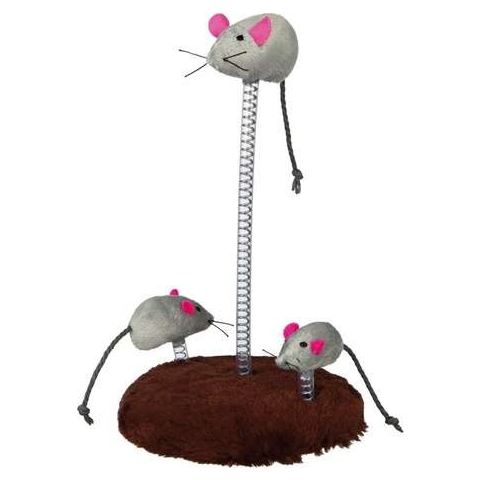 Talpon álló macskajáték fémrúgókra rögzített plüss egérkékkel. A talp rész barna színű szőrmével bevont, ami macskamentával kezelt, így különösen ösztönzi a cicát a játékra. A 3 rugós egér szintén mentával kezelt. A parafa talp nehéz, így nehezen felborítható.