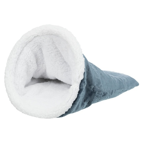 Ez egy puha plüssből készült, kívül kékes-zöld (szöveg mintás), belül fehér bebújós fekhely. A macskák imádják a meleg, puha, bebújós fekhelyeket, így ez egy tökéletes választás macskád számára. Méretei: ø 40 × 60 cm. A 60 cm-es átmérőjű száj karimájában egy fém gyűrű található.