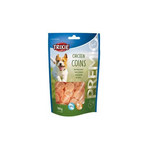 Trixie Premio Chicken Coins - jutalomfalat (csirke) kutyák részére (100g)Fehérjében gazdag, szárított csirkehúsból készült csemege kutyáknak, 70 % hústartalommal. Glutén-, és cukormentes, light kutyacsemege, melyet diétázó kutyák is nyugodtan fogyaszthatnak. Visszazárható tasakban.Kiszerelés: 100 g