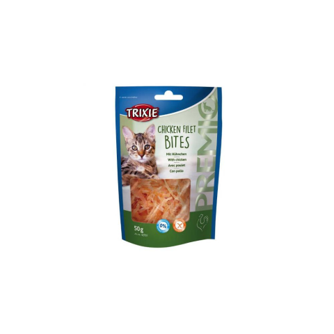 Trixie Premio Chicken Filet Bits - jutalomfalat (csirke) macskák részére (50g)Kiváló minőségű, csirkehúsból készített gluténmentes jutalomfalat kölyök- és felnőtt macskák részére.Glutén és cukor mentes snack.Hústartalom: 72%Visszazárható csomagolás