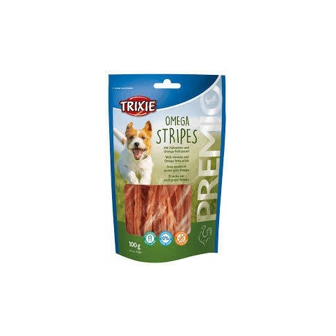 Trixie Premio Omega Stripes - jutalomfalat (csirkemell) kutyák részére (100g)Csirkemellből készült finom csíkok, legalább 85 %-os hústartalommal. Gazdag fehérjében, valamint Omega-3 és Omega-6 zsírsavakban. Glutén- és cukormentes. Visszazárható zacskóban.Kiszerelés: 100 g