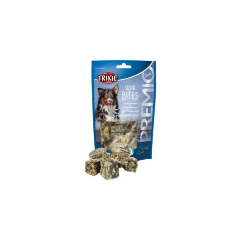 Trixie Premio Sushi Bites - jutalomfalat (fehér hal) kutyák részére (75g)A Trixie Premio Sushi Bites falatkák igazi kulináris élvezetet nyújtanak kedvenceinkenk, mivel 100%-ban fehérhalból készülnek. Gazdagok fehérjékben és természetes forrású Omega-3 és Omega-6 zsírsavakban. Visszazárható tasakban. Light kutyacsemege.Kiszerelés: 75 g