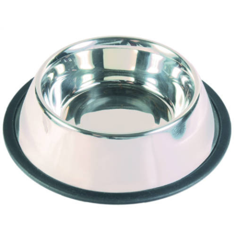 Trixie rozsdamentes acél etetőtál, talpasRozsdamentes acél tál, mely a tapadást biztosítő műanyag perem eltávolítása után akár mosogatógépben is mostható.Méret: 0,9 l / ø 17 cm