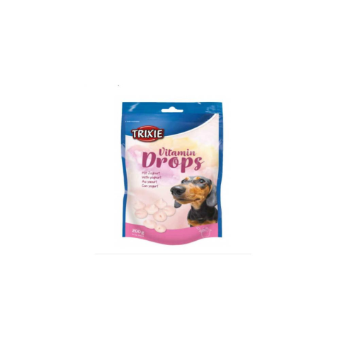 31643 - Trixie Vitamin Drops joghurtos vitaminfalatkák kutyáknakFontos vitaminokkal dúsított, joghruttal készült falatkák kutyák számára. Finom és egészséges csemege, apró, gyorsan fogyasztható falatokban, visszazárható zacskóban.Kiszerelés: 200 g