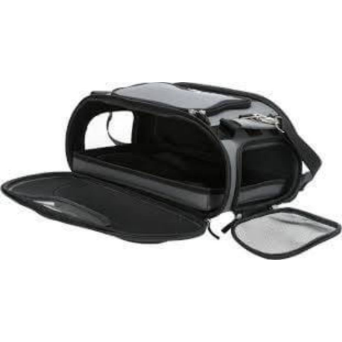 Kényelmes szállítótáska kistestű kutyáknak. A termék jellemzői röviden: ideális kézipoggyászként a repülőn a legtöbb légitársaság elfogadja trolley kocsihoz rögzíthető oldalt, felül és elöl is nyitható külső zsebbel 2 fogantyúval levehető vállpánt integrált rövid vezetékkel, amelyre például a kutyahám rögzíthető párnázott és vízálló fenéklap, kivehető alaktartó EVA poliészterrel Méretek: 28 × 23 × 46 cm, Maximális terhe