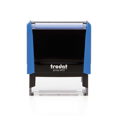 Bélyegzőház Trodat 4913 4.0 kék, fekete párnával Megnevezés: Trodat 4913 bélyegző Bélyegzőházszín: kék Lenyomatszín: fekete lenyomatméret: 58 × 22 mm javasolt sorok száma: 6 cserepárna: 6/4913