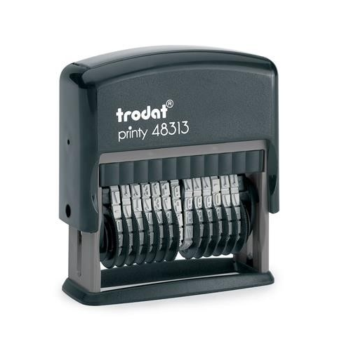 13 számkarakteres számbélyegző lenyomatméret: 26 × 9 mm javasolt sorok száma: 2 számok és dátum magassága: 3,8 mm számszalagok száma: 13 cserepárna: 6/4817 Gyártó/első EU forgalmazó elérhetősége: Trodat GmbH. A-4600 Wels / AUSTRIA Linzer str.156. info@t