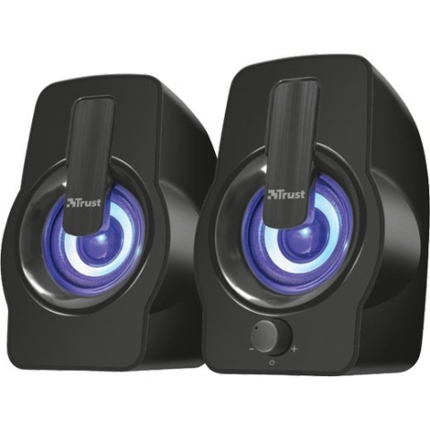 Kompakt hangszórókészlet stílusos kialakítással és RGB LED-világítással. Előnyök: 12 W-os csúcsteljesítmény (6 W teljes effektív kimeneti teljesítmény) LED megvilágítás automatikus színciklussal Minden asztali számítógéppel és laptoppal működik Könnyen elérhető hangerőszabályzóval a hangszóró elülső oldalán. USB táplálású – nincs szükség fali csatlakozóra