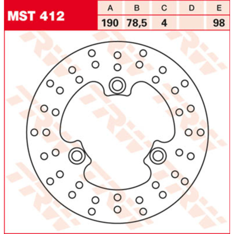 TRW Lucas féktárcsa MST412 Merev féktárcsa, kerek külső kontúrral és perforált fékszalaggal. Műszaki adatok: Külső átmérő: 190 mm Belső átmérő: 78,5 mm Vastagság: 4 mm Tulajdonságok: Minden féktárcsa rendelkezik ABE tanúsítvánnyal. Az összes változat, mint az Allround, RAC és EC-offroad tárcsák, rendkívül méretstabil és edzett acélból készülnek.
