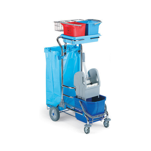Elvis ET 1 krómozott, fémvázas szervizkocsi. TEC préssel. 2 darab 15 literes tartállyal, különböző színekben a különböző tisztítószerek tárolására. Mérete: 45x80x120 cm.
