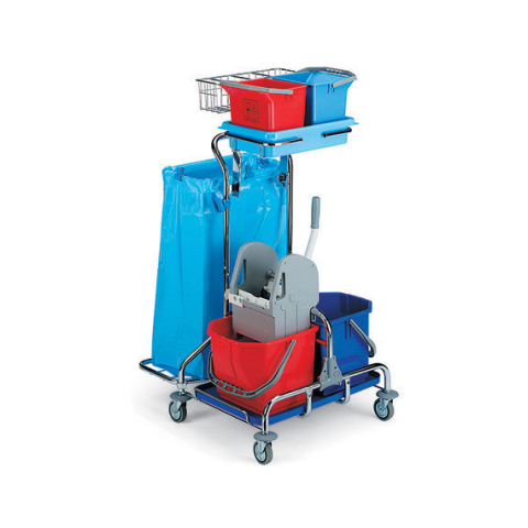 Elvis ET 20 krómozott, fémvázas, kétvödrös szervizkocsi. TEC préssel. 2 darab 15 literes tartállyal, különböző színekben a különböző tisztítószerek tárolására. Mérete: 60x78x120 cm.