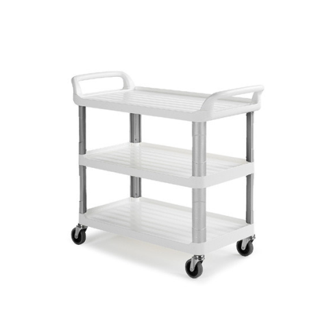 Shelf kiszolgálókocsi 3 részes, fehér vagy szürke. Műanyag tartókkal. 150 Kg maximális teherbírás. Mérete: 90x50x102 cm.
