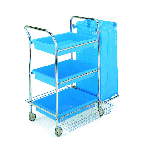 Tecno 62 fémvázas krómozott szervizkocsi . 120 literes szemeteszsáktartóval. Tartalmazza: - Tálcatartó kerekekkel - L020014 - Kerekekkel ellátott forgócsapágy - L020013 - Fém rudak - H070101 - 120 literes zsáktartó - L050011 - 3 központi kosár - 43
