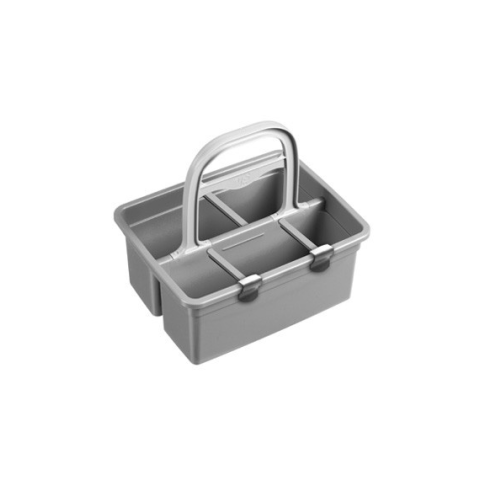 Tisztítószer tartó szürke, szállodai felhasználásra. TTS Eroy vödörhözFlakontartó ergonomikus fogantyúval és 3 elválasztóval. Segítségével a flakonok és a tisztítószerek könnyen szállíthatóak.Anyaga: polipropilén Mérete: (Sz*H*M) 26*33*31