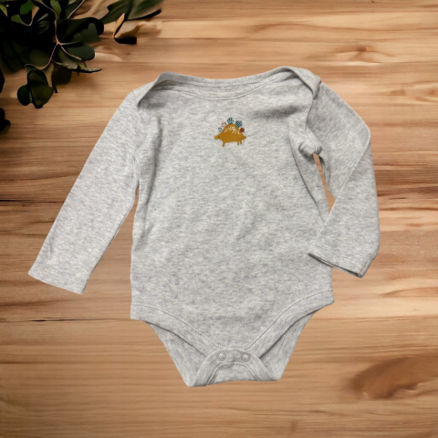Dinós hosszú ujjú szürke body Egyenes szabású, kerek nyakkivágású, ülepnél patentos. Szép állapotú.