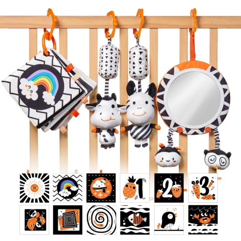 A kontrasztos fekete-fehér színű prémium minőségű plüss fejlesztő játék szettben található pihe-puha, ölelgetnivaló cuki csilingelős figurák, kontrasztos babakártyák és a mókás babatükör nélkülönözhetetlen kellékei minden kisbabának, melyeket babakocsira,