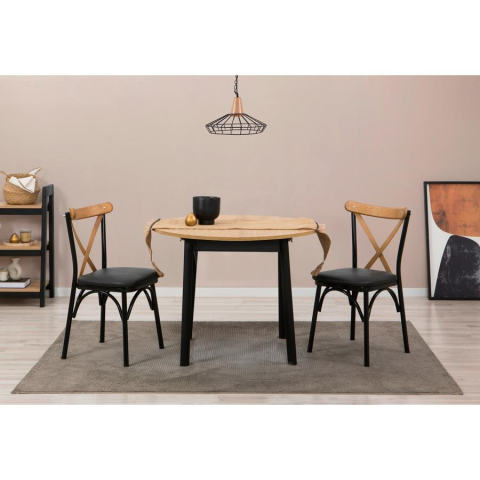 Alakítsa át étkezőjét egy stílusos és funkcionális térséggé az Extendable Dining Table & Chairs Set készletünkkel. Ez a 3 darabos szett úgy van tervezve, hogy emelje az étkezési élményt, és lenyűgözze vendégeit modern és letisztult dizájnjával.Elegáns és Sokoldalú DizájnA asztal 100%-ban melamin bevonatú forgácslapból készült, fából készült lábakkal, biztosítva a tartósságot és a stabilitást. A tölgy és fekete színkombináció egy csipetnyi kifinomu