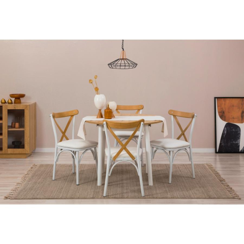 Változtassa át étkezőterét ezzel az elegáns és sokoldalúan használható, kihúzható étkezőasztal és székek készlettel. Tapasztalja meg a stílus és a funkcionalitás tökéletes ötvözetét ezzel a lenyűgöző, 5 darabos készlettel. A 100% melaminbevonatú forgácslapból készült étkezőgarnitúra tartósan készült, így hosszú éveken át élvezheti az asztal körüli szórakozást és az emlékeket. Meleg és hívogató hangulatot teremtA tölgyfa és a fehér szín gy