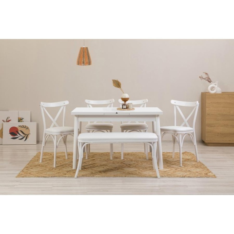 Alakítsa át étkezőjét egy luxus és hívogató térséggé lenyűgöző Kihúzható Étkezőasztal és Székek Szettünkkel. Ez a 6 darabos szett arra lett tervezve, hogy emelje étkezési élményét, és lenyűgözze vendégeit elegáns és modern dizájnjával.Elegáns és Funkcionális DizájnAz étkezőasztal letisztult és stílusos dizájnnal rendelkezik, fehér melamin bevonatú forgácslap asztallappal, amely tartós és könnyen tisztítható. Az asztal könnyen kihúzható, hogy