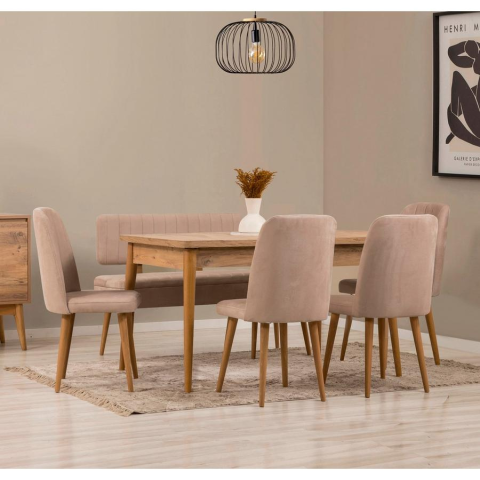 Alakítsa át étkezőjét egy stílusos és funkcionális térré az Extendable Dining Table & Chairs Set készletünkkel. A 100%-ban melamin bevonatú forgácslapból készült készlet nemcsak tartós, hanem könnyen tisztítható is, így tökéletes a mindennapi használatra. Az elegáns gyertyán lábak egy csipetnyi kifinomultságot adnak a dizájnhoz, míg a székek 100%-os lenvászon anyaga kényelmet biztosít a hosszú étkezések során családtagokkal és barátokkal.Elegáns dizáj