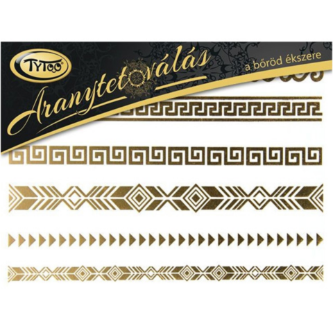 Egyszerűen felhelyezhető a bőrfelületre a TyToo Aranytetoválás látványos mintái, melyekhez csak egy nedves ruhadarab vagy szivacs szükséges. A Karkötő, bokalánc szettben hat eltérő mintát találnak a gyerekek, amit a bőrükre helyezve a nedves szivaccsal kell rásimítani a bőrükre, majd a papírt eltávolítva a minta a bőrön marad. A tetoválás vízzel vag