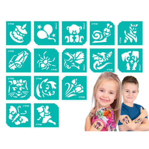 Sablon szett - szülinapos - 15 db-os A sablon szett 15 db, gyerekeknek készült szülinapi mintát tartalmaz, melyeket használhat csillámtetováláshoz, vagy egyéb testfestéshez. Olyan slágermintákat kap egy csomagban, mint a cica, maci, kutya, csiga vagy sárk