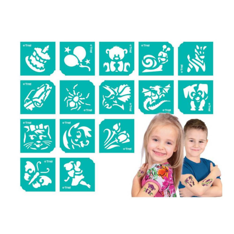 A sablon szett 15 db, gyerekeknek készült szülinapi mintát tartalmaz, melyeket használhat csillámtetováláshoz, vagy egyéb testfestéshez. Olyan slágermintákat kap egy csomagban, mint a cica, maci, kutya, csiga vagy sárkány, melyek biztos örömet szereznek a gyerekeknek.