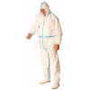 TYVEK CLASSIC PLUS VÉDOOVERALL:kék szalaggal fedett, leragasztott varratok, plusz biztonsági hegesztésIII. kategória 4. típusú védelme aerosolok, permetek, alacsony koncentrációjú szervetlen vegyületek és biológiai veszélyek ellen ishüvelykujjra húzható gumipántTyvek 1431N polietilén anyagú (41 g/m2), fehér, kapucnis védőoverallvéd 1