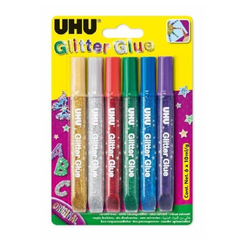 Folyékony ragasztó - hat különböző színű ragasztó gél, dekoratív csillámokkal, 4-6 óra alatt szárad Az UHU Glitter Glue 6 × 10 ml Original folyékony ragasztó készlet tökéletes a kreatív alkotáshoz, üdvözlőkártyák, húsvéti tojások, képkeretek és egyéb dekorációs elemek díszítéséhez. Hat különböző szí