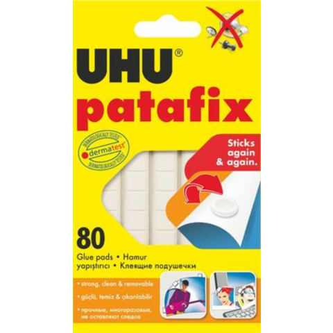 A Gyurmaragasztó, 80 kocka/csomag, UHU Patafix (UHU39125) Eltávolítható és újra felhasználható, fehér színű ragasztópárnák iskolai, irodai és otthoni felhasználásra. -egyszerűen, gyorsan és tisztán rögzít -ideális papír és kisebb tárgyak ragasztásához -a