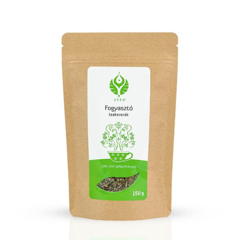 Fogyasztó teakeverék 150gGluténmentes magyar termék, 100% natúr gyógynövényekből, hozzáadott aromák nélkül.Az UKKO Fogyasztó Teakeverék egy 100% natúr, biztonságosan fogyasztható és finom gyógynövénykeverék, amivel Te is megtapasztalhatod az eredményes és tartós fogyás élményét, helyre rakhatod az emésztésed és megerősítheted az immunrendszeredet, hogy teljesebb, kiegyensúlyozottabb és egészségesebb életet élhess.A benne található gyógynövények jót