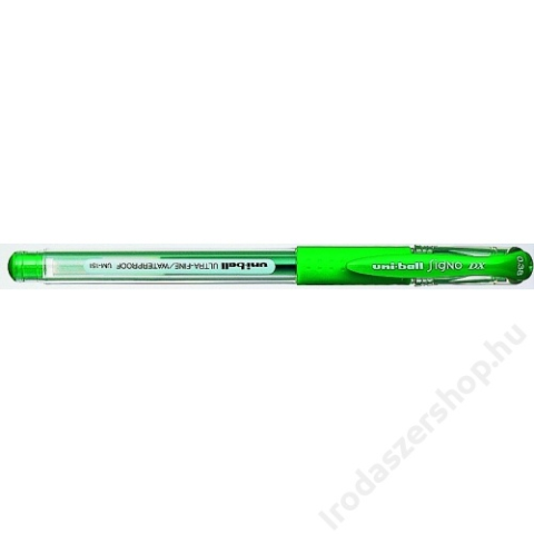 Zseléstoll, 0,25 mm, kupakos, UNI UM-151 Signo DX, zöld (TU15141) '- átlátszó, műanyag tolltest - gumi ujjpárna - műanyag klipp - rozsdamentes acél tollhegy - kupakos kivitel - a tinta színével megegyező klip, fogórész és tollvég - rövidített, ingz