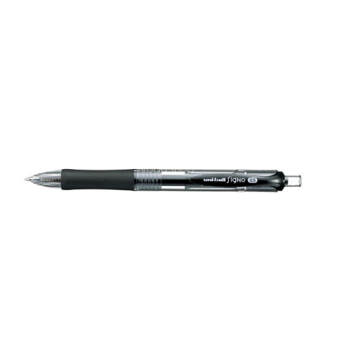 Zseléstoll, 0,3 mm, nyomógombos, UNI UMN-152, fekete - átlátszó testű - a tinta színével megegyező gumi ujjpárnájú - a tollhegyet kioldó klip-szű - zsebbiztos hibridtitájú golyóstoll - nagytartályos betétjével kiválóan alkalmas irodai, iskolai használa