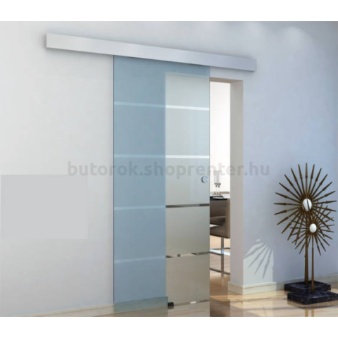 Alabama üveg tolóajtó, savmart csíkozott, RS120 szerelvényekkel - Modern és elegáns, 8 mm vastag edzett üvegből gyártott, tartó konzolra függeszthető ajtólap. A görgős mechanika segítségével a tolóajtó könnyen mozgatható. Felszerelése nem igényel szakértelmet.