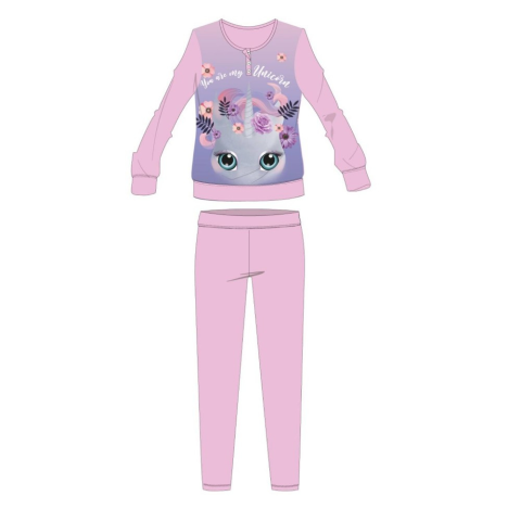 Unikornis téli pizsama gyerekeknek 100% pamut alapanyagból. Kényelmes bőrbarát viselet. Gombos nyakkialakítással, gumírozott derékrésszel, egyenes, szűkített szárral, Unikornis mintával. Méret: 110 Díszdobozban szállítjuk.