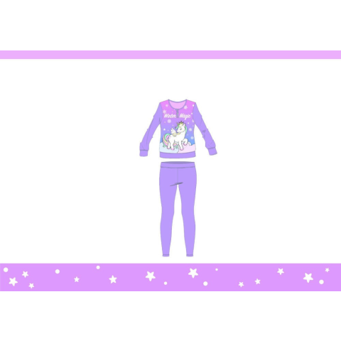 Unikornis téli pizsama kislányoknak. Gombos nyakkialakítással és gumírozott derékrésszel, egyenes, szűkített szárral. Anyagösszetétel: 100% pamut Méret: 140 Díszdobozban szállítjuk.