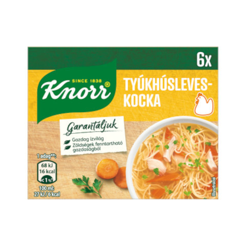 Knorr Tyúkhúsleves kocka – 60 g Rövid leírás A Knorr Tyúkhúsleves kocka 60 g-os csomagolásban gazdag, gyorsan oldódó alaplevet ad, amely a húsos ízvilágot krémesen kiemeli. Ideális gyors levesek, mártások és egytálételek alapjaként. Kiemelt előnyök