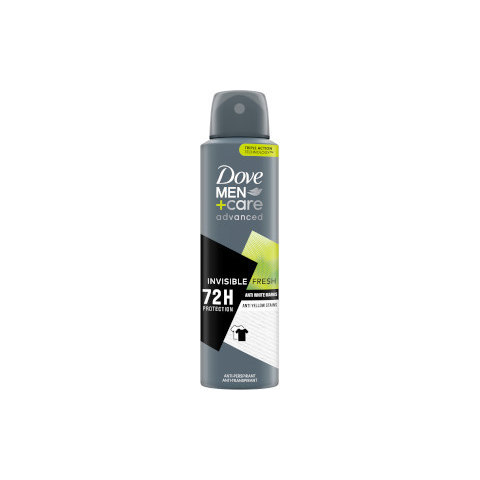 Dove Men+Care Invisible Fresh Deodorant – 150 ml Férfiak számára tervezett Dove Men+Care Invisible Fresh dezodoráló spray, mely védelmet nyújt a verejték és a kellemetlen szag ellen anélkül, hogy a ruhákon fehér nyomokat hagyna. A láthatatlan formula
