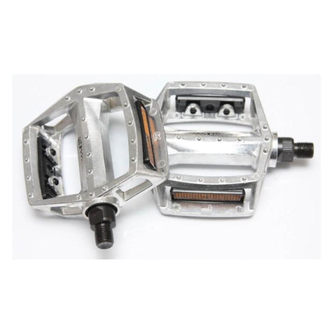 Union K-370 fél colos, kismenetes alu platform pedál ezüst 1/2 colos (12,5 mm-es) "kismenetes" tengelyű, a hagyományos 9/16 colostól vékonyabb tengely átmérőjű platform pedálok. Régi BMX-eken, és kovácsolt acél "Z" hajtóműveken találkozhatsz ilyen pedálokkal. Kicsit gyengébb az elterjedtebb 9/16-os tengelyű verziónál. Natúr alu színben, alu testtel. Hagyományos csapágyazású. Párban. 500 g/ pár.Az ár minden pedál esetében egy párra vonatkozik!