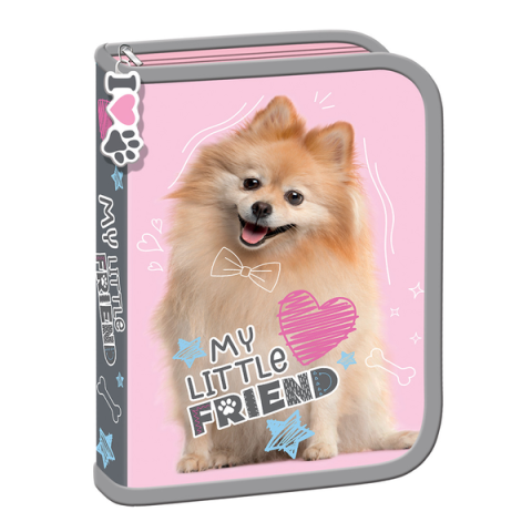 A My Little Friend kutyás kihajtható tolltartó tökéletes választás minden kis állatbarátnak, aki imádja a kutyusokat! A tolltartó egyik oldalán egy bájos pomerániai kutyus mosolyog vissza rózsaszín háttér előtt, szívecskékkel és vidám grafikákkal díszítve, míg a másik oldalon vidám kutyás minták és játékos feliratok (pl. „Ready to play”, „