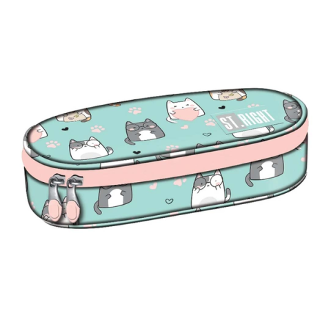 A St.Right Charming Cats ovális tolltartó minden cicakedvelő kisdiák álma! Ez a 23x9,5x6 cm méretű tolltartó elragadó dizájnjával hódít: pasztell türkizkék alapon bájos macskás figurák, apró rózsaszín mancsnyomok és szívecskék díszítik, amit a rózsaszín cipzár és húzóka tesz teljessé. A barátságos minták vidám hangulatot csempésznek a tanulással