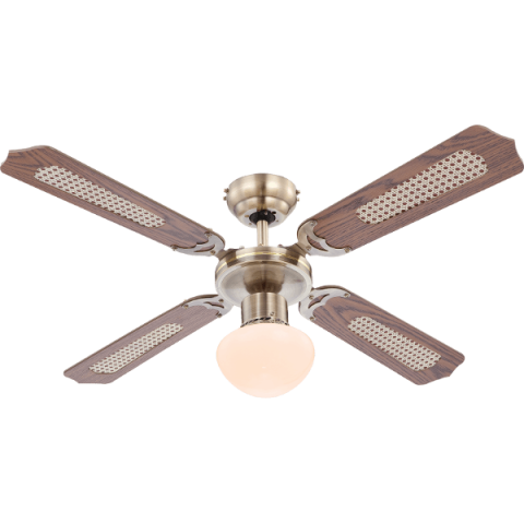 Mennyezeti ventilátor világítással, 4 lapáttal. Méret: átmérő 107,7 cm, magasság: 41,5 cm. Anyag: krómozott armatúra, MDF lapátok. 3 sebességfokozat. Teljesítmény 50W. E27 foglalat. Fényforrás nélkül értékesítjük.