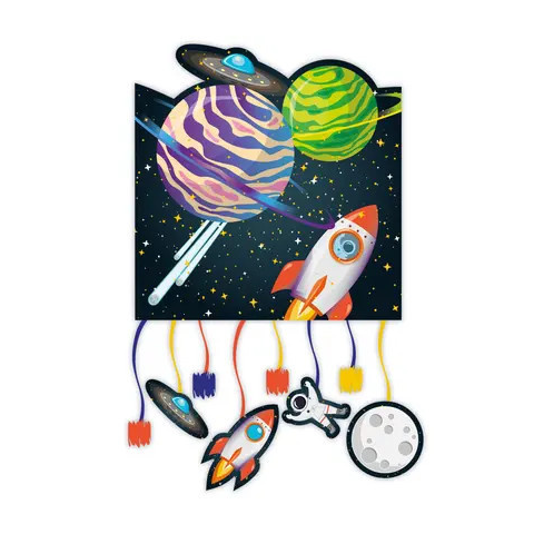 Space, Űr pinata játék A Pinata játékot apró játékokkal, cukorkával, csokoládéval, stb. lehet megtölteni, mielőtt a vendégek megérkeznek. Fel kell lógatni olyan helyre, hogy alatta elférjenek a játékosok és a gyerekek elérjék a lelógó szalagokat.